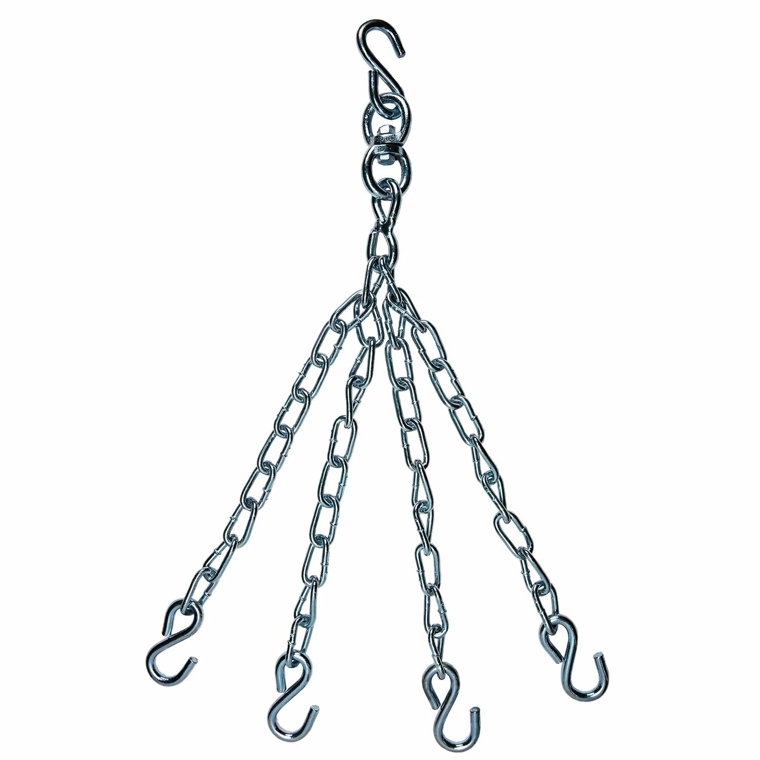 Thicker and more durable stainless steel chain links and pro style swivel with zinc galvanized finish offers increased strength, more efficiency and tangle-free heavy bag training. Pro style swivel allows heavy bag to naturally move and spin without bunching or knotting. Includes four high strength end S-Hooks for quick and convenient attachment. Fits heavy bags with four top D-rings. Ideal for heavy bags up to 100 lbs. 24” Length.